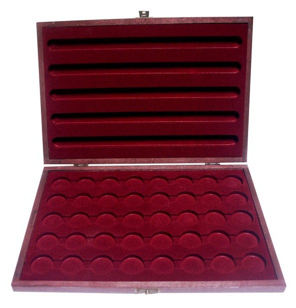 Dřevěná kazeta pro 40 mincí – Ø 31 mm. Vhodné např. pro zlaté dukáty, 2-dukáty, 10 – 20 Ag R-U koruny včetně kapsle a jiné…