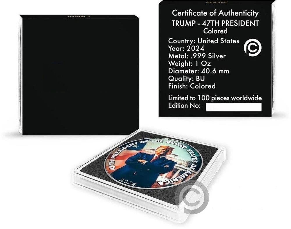 Sběratelská investiční mince 1 USD American Eagle Donald Trump 47. prezident USA 1 oz Ag 2024 v originální plastové čtvercové kapsli, papírovém obalu.