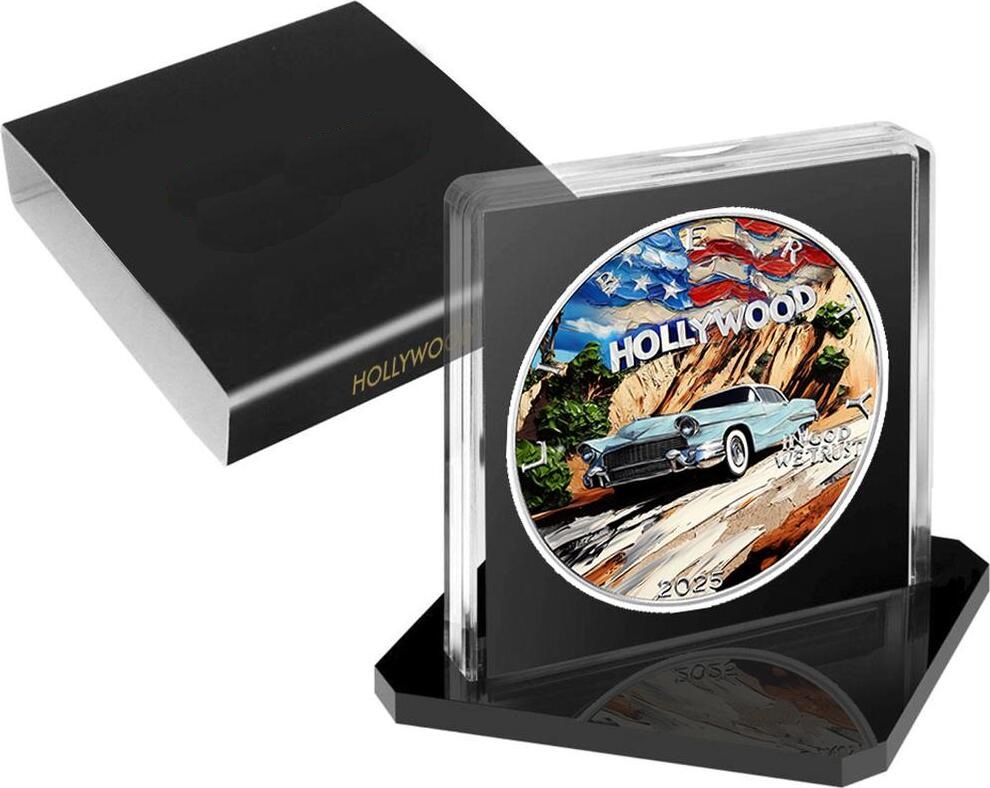 Sběratelská investiční mince 1 USD American Eagle Hollywood AmericArt 1 oz Ag 2025 v originální plastové čtvercové kapsli, papírovém obalu.