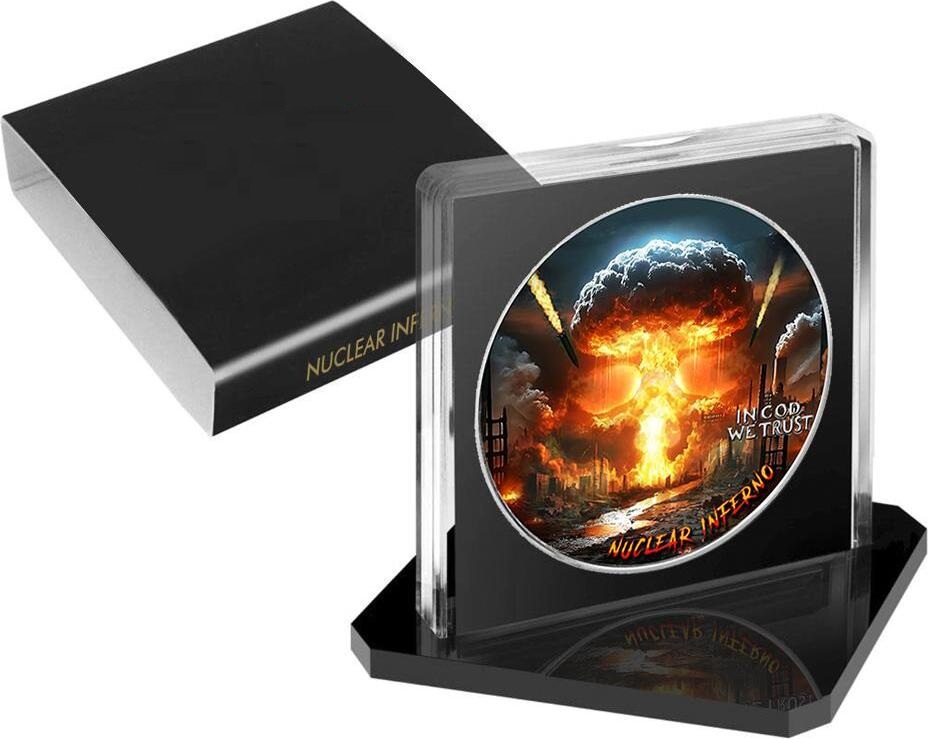Sběratelská investiční mince 1 USD American Eagle Nuclear Inferno – Nukleární výbuch 1 oz Ag 2024 v originální plastové čtvercové kapsli, papírovém obalu.