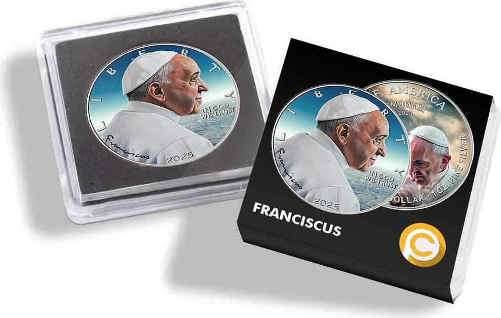 Sběratelská investiční mince 1 USD American Eagle Papež František In Memoriam 1 oz Ag 2025 v originální plastové čtvercové kapsli, papírovém obalu.