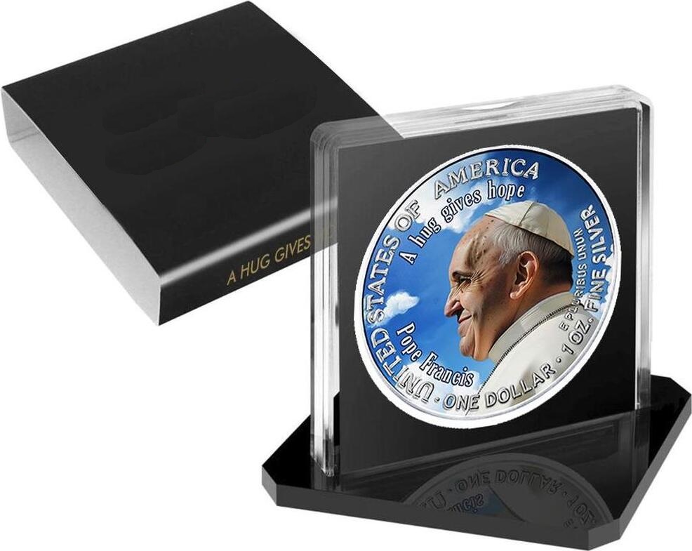 Sběratelská investiční mince 1 USD American Eagle Papež František Pozdrav 1 oz Ag 2025 v originální plastové čtvercové kapsli, papírovém obalu.
