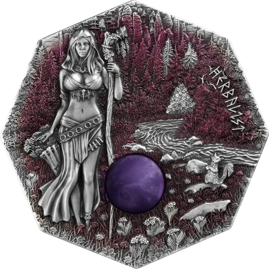 Zušlechtěná verze druhé mince z unikátní série od Germania Mint: 2025 Witchcraft: Herbalist 2 oz Silver Ultra High Relief. Kolekce představuje germánské ženy, které měly tajné znalosti a moc, podporovaly zdraví, odháněly zlé duchy a prováděly magické rituály.