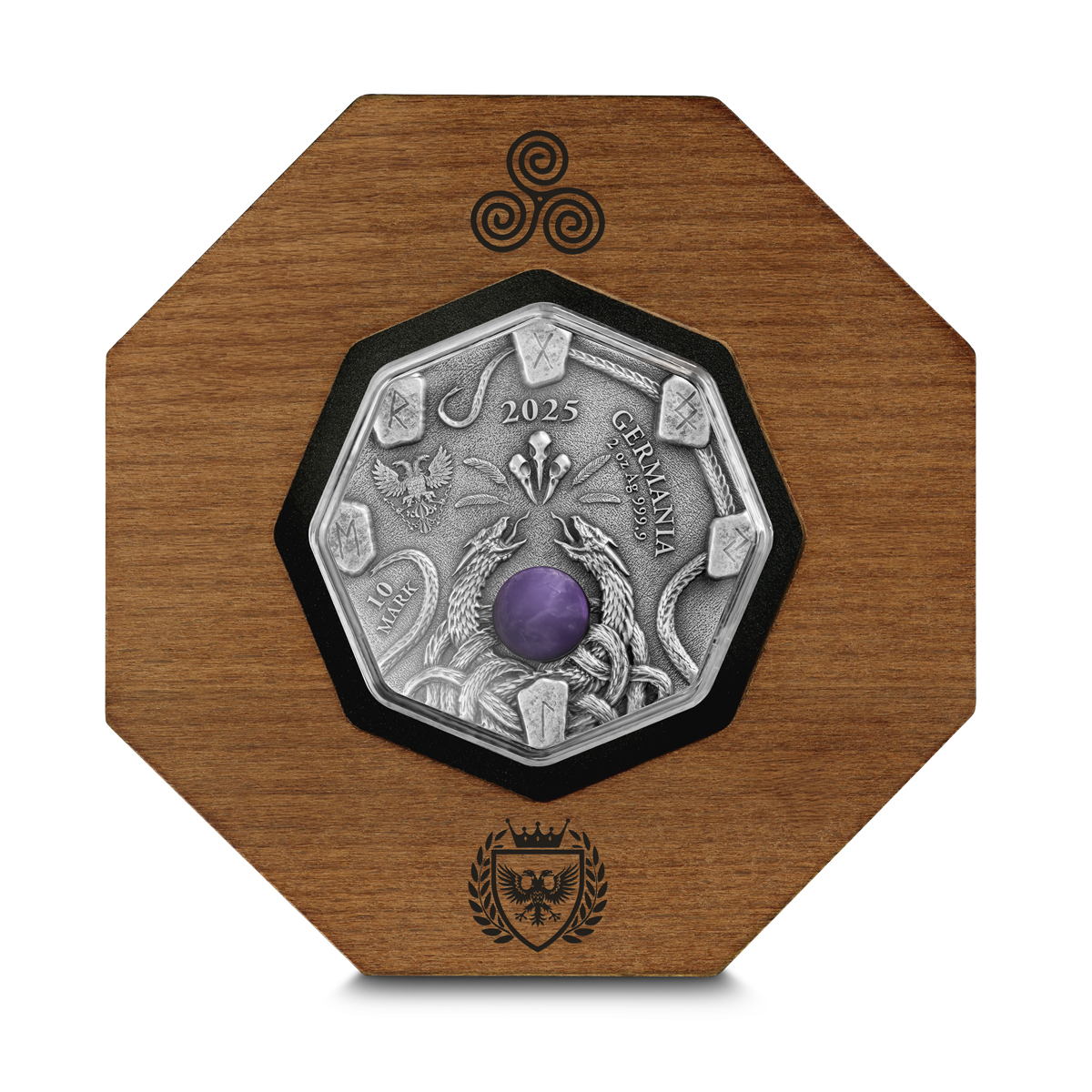 Sběratelská investiční mince 10 Mark Witchcraft Herbalist 2 oz Ag 2025 High Relief, ametyst, UV efekt v originální plastové kapsli a dřevěné kazetě s displeyem včetně certifikátu.