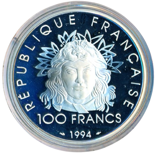 Sběratelská investiční mince 100 Francs LOH Lillehammer 1994 – oštěp Proof