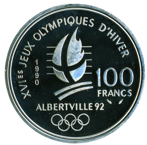 Sběratelská investiční mince 100 Francs ZOH Albertville 1992 – rychlobruslení Proof