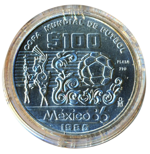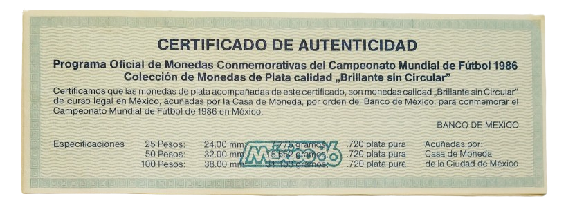 Sběratelská investiční sada stříbrných mincí 25 + 50 + 100 Pesos MS ve fotbale Mexiko 1986 – b.k. v originální etuji včetně certifikátu. Mince jsou v bezvadném stavu.