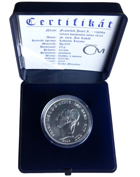 Stříbrná medaile Františe Josef I. – replika konvenčního tolaru 1852 – 2007 je v plastové kapsli a etuji s certifikátem.